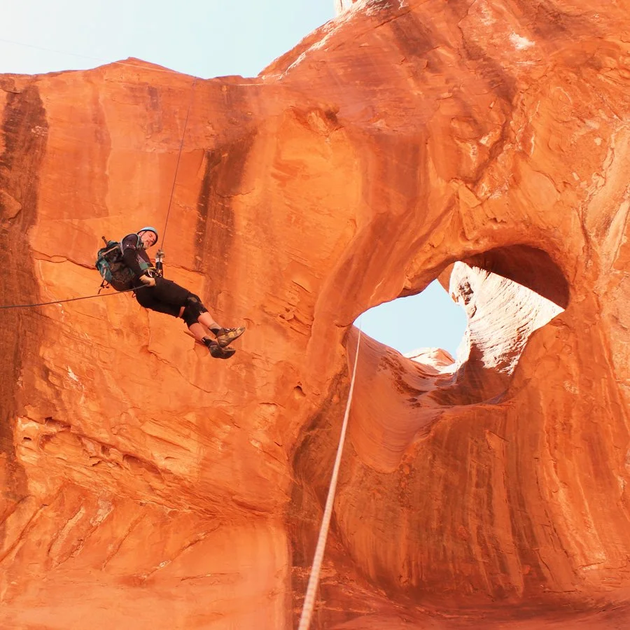 I already had a plan for how to do the Arch leaving nothing behind, and NOT pulling the rope over the arch (as people had been doing, leaving rope grooves on the rock). But here we were, 30 feet above the enticing arch, and we needed an anchor. There was a sturdy enough small arch in a perfect location. Instead of slinging the small arch, I tied a foot long loop of rope and poked it through the arch, and stuck Ram's trekking pole through it on the other side. The arch was small, the bending force on the pole would be small. We rappelled down, pulled the pole out with another piece of rope and retrieved the rappelling line. Crude, but... The question became, was there a way to do this in general, ideally with the rappel rope coming down with no knots, clean.