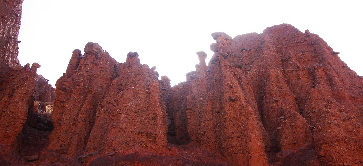 The warmth of the sun felt good, but climbing steeply uphill, it started feeling hot! After we climbed 2000 feet or so, Ram and Rick chose a route in, and we downclimbed a steep, loose, dangerous gulley (no pictures), traversed back and forth on an extremely loose, chossy, steep, scary face (one picture, from below) and eventually found ourselves in the delightful shade of the canyon bottom. Ah yes, the Death Valley experience, I remember it well...