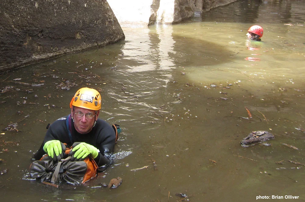 Next morning, with the canyon full, the day begins with a short downclimb into the "snake pit" and a nice swim. At other water levels, this looks like a nasty keeper pothole. At this level - cake!