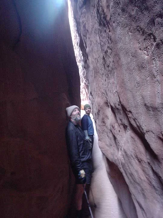 The NF of RR is a challenging system to exit. Tom had worked some routes out and researched some others and they came into play during the week. We ended going up a side canyon and out to the top bench land. Ryan obeyed his elders and became our designated climbing gun on anything the old-timers felt like passing on (re: scared). With a little support for a foothold and some cheerleading, he climbed up a dryfall and offered a sling to the tentative old folks, who gratefully took it. What followed was a series of small and physical chockstone problems to climb, most solved by stemming up early and over the top of the barriers. Then the expansive views and the trudge up to one of the cars. The weather did more than hold. We were greeted by periodic sun and temps in the 40's.