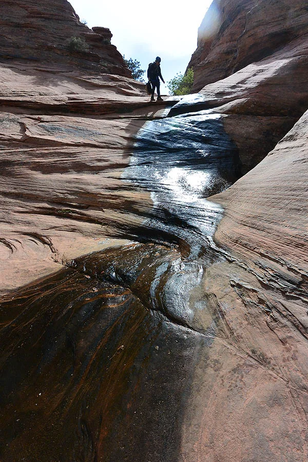 Is it MAY, already? Where does the time go? Elana is back in Springdale briefly between travelling the world (Israel, Jordan, Spain, Portugal, Morocco!) and moving to Silverton to guide for Outward Bound—and with the fine weather, a canyoneering adventure seemed to be in order. With the recent rain, something casual please. How about Spry? We met somewhat early and shuffled cars around, and started hiking. The weather report was a little iffy for the afternoon, but it was plenty hot in the morning! We trudged up the steep, sun-bathed slickrock using a lively, multi-faceted conversation to keep the motivation up, and soon found ourselves at the first rappel.