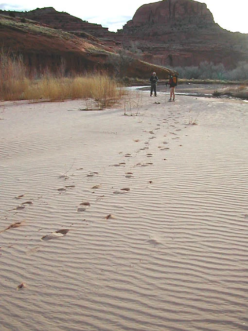 One *feature* of the Fence Canyon campsite, is that you get to cross the Escalante River first thing in the morning. Here, John and Mike eschew some of the usual garments for the sake of economy.