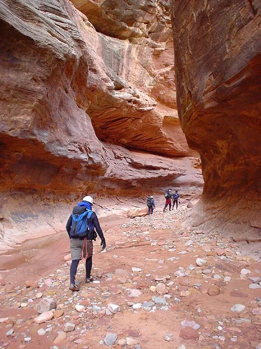 Notes: The Upper Slot of Stair is really good, but is fairly difficult and involves some high chimneying. Probably the best way to do it is as a quick sport route, without packs. The narrowest, closest slot can be bypassed on slabs to the right, and the canyon can be exited back to the top on canyon left at the bottom of the section. The chimneying is about 40 feet off the deck, probably about 5.8, depending on height, and even the smallest canyoneers will not be able to go down. Enter at your own risk.
