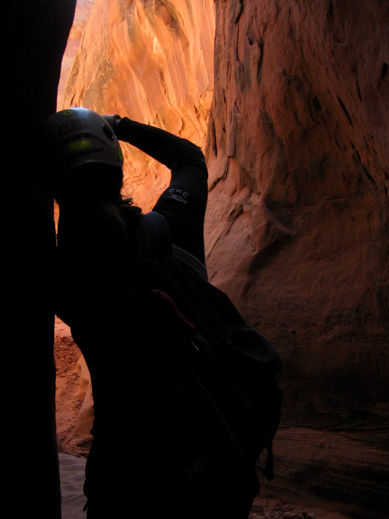 After the rappel, the canyon gets super skinny, and dark. Everyone has to stem a section of about 60 feet. Very narrow, very strenuous, but very short.