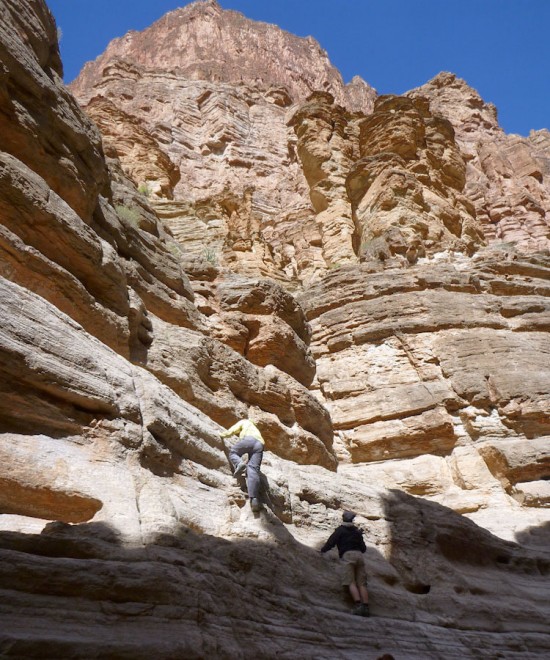 With not much water to be found, we dropped canyon gear at the Redwall exit near Rocky Point Canyon, then proceeded downcanyon looking for a water source, finally finding it at Dome Pocket Canyon intersection, camping there at twilight.
