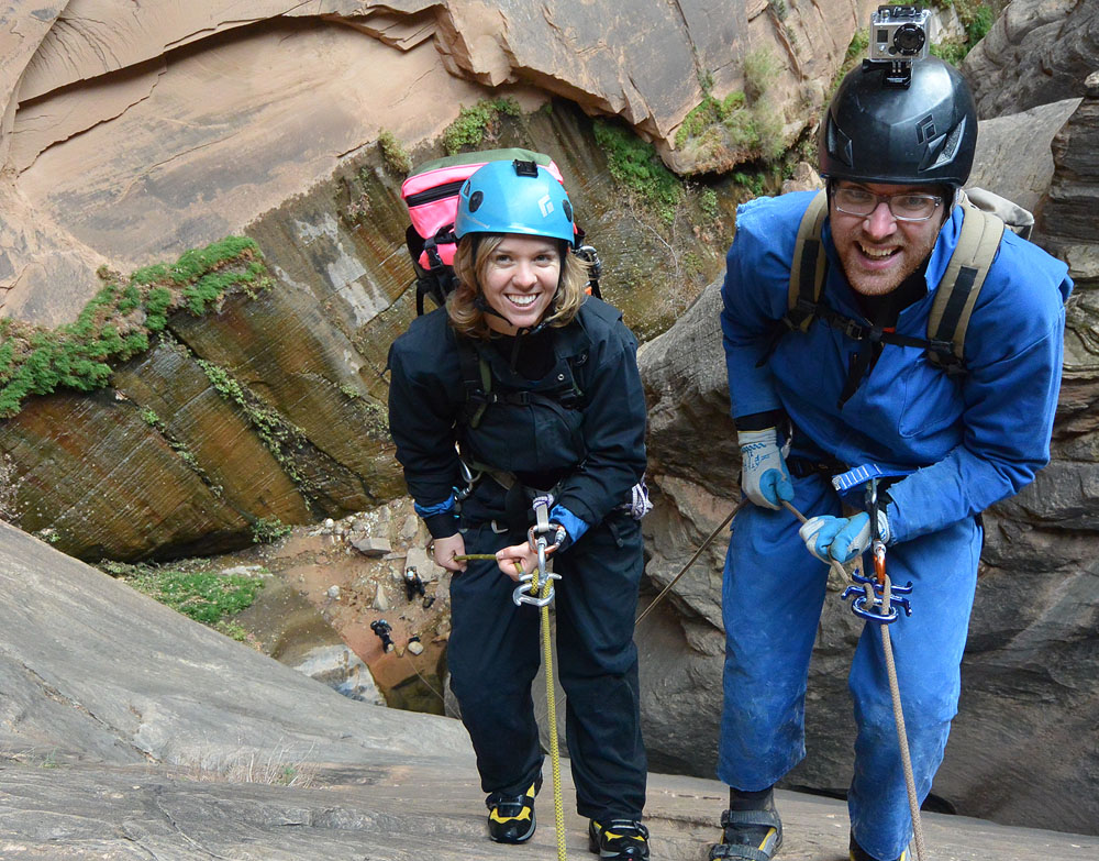 Final rappel had many fewer tourists than usual, but was especially slippery. Amanda recognized that with the Scuttlebutt and Coverall, perhaps a buttslide down would be fun...
