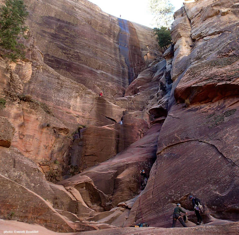 Be very careful on the last rappel, as it goes into The Narrows in a place where hikers are likely present. Thankfully, there is little to no loose rock, but it will require conscientious ropework to not endanger those below. The first person will need to rappel with the rope bag rather than tossing it. Feeding the rope down does not work due to a rope-catching ledge. People in The Narrows will not be able to hear a call of "ROPE" due to the water noise and would be unlikely to understand what that means. Dropping the ropebag into the Narrows is also not recommended; the bag might get carried away by the current, resulting in an annoyingly unresponsive bottom belay. (Ask me how I know).