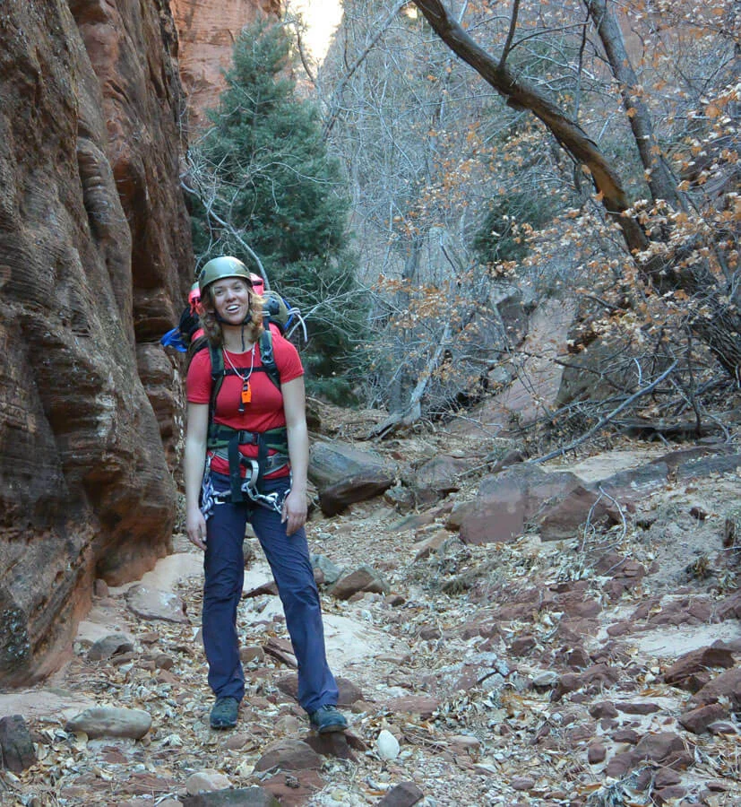 Like Goldilocks, it is important to get the entrance rap just right. Rappel too high in the canyon, and you will end up in a steep, brushy gully. Rappel too low, and the drop is longer than 300 feet. There is a good place to rappel just downcanyon of a shallow corner, which ends in a sparse clump of trees. Find this exact spot.
